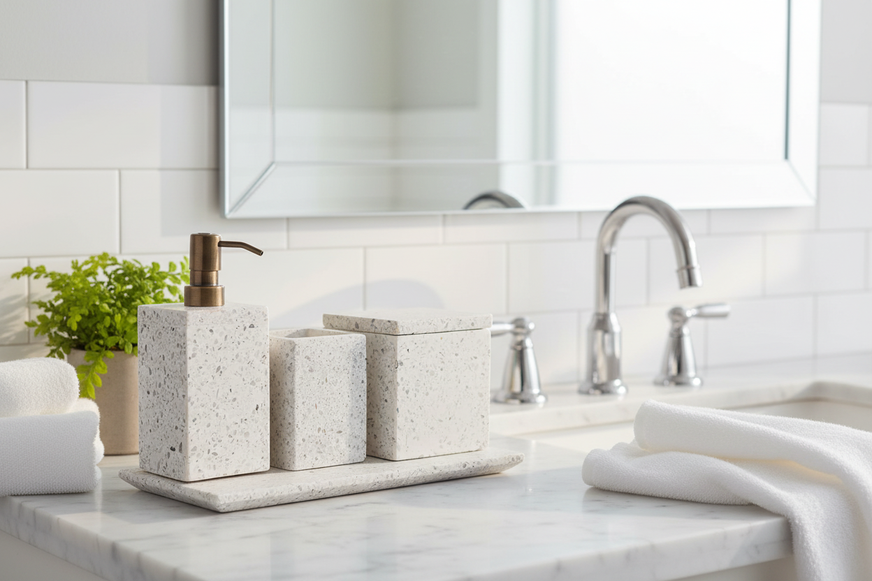 This 5-piece bathroom set is made of square polished white marble. Consists of a square soap dish, toothbrush cup, a soap dispenser with a metallic dispenser head and cosmetic box with lid. A beautiful set of accessories for your bath as well as making a unique gift choice. Expect differences in texture, colour, grains etc., as this product is extracted from a natural source. This is a natural configuration and should not be considered as a defect.