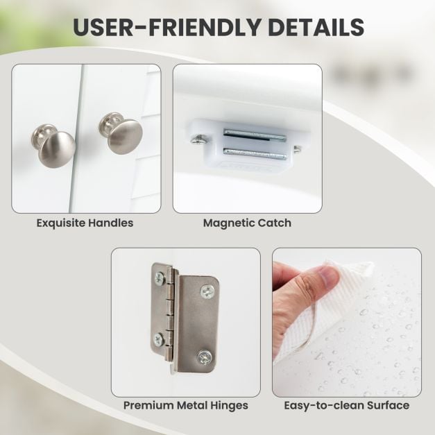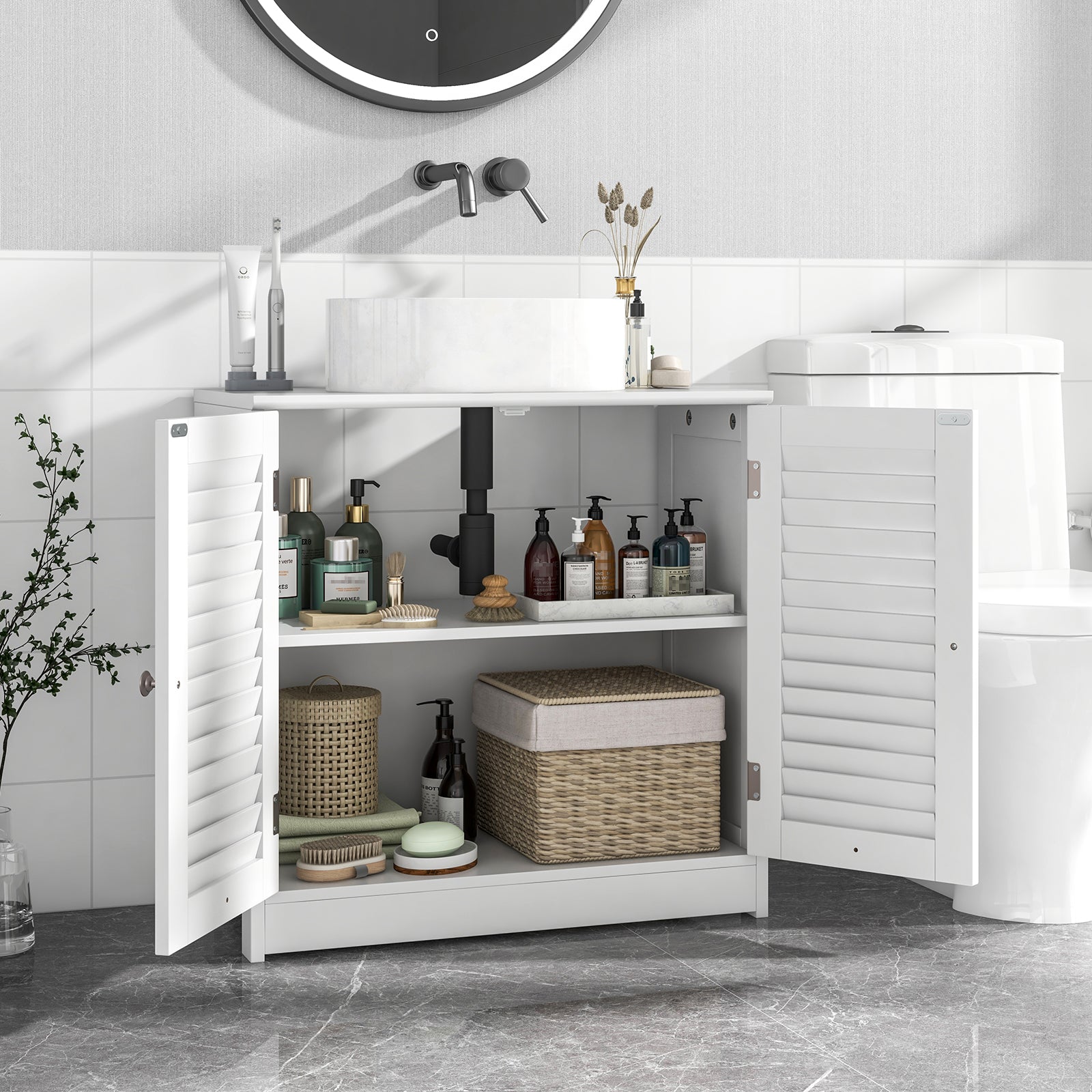 Shutter Door Design: 2 shutter doors keep your stored items ventilated to prevent odor and dirt buildup for long-term storage. Additionally, the unique shape adds a stylish touch to the bathroom sink organizer cabinet, enhancing the overall aesthetic appeal of the bathroom.
