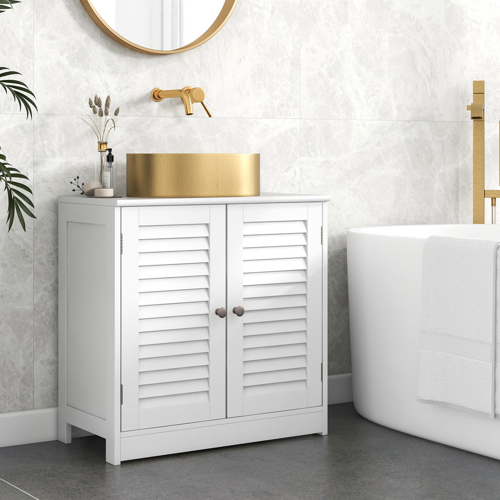 Equipped with 2 doors, a shelf and a spacious countertop with a U-shaped cutout, this bathroom under sink cabinet can keep all of your toiletries well organized and within easy reach. The shutter door design not only promotes air circulation, but also adds style. Moreover, made of premium boards with waterproof paint, this bathroom floor cabinet ensures long-lasting durability and allows for easy cleaning. With a compact size, this space-saving sink cabinet is a perfect storage solution for small bathrooms.