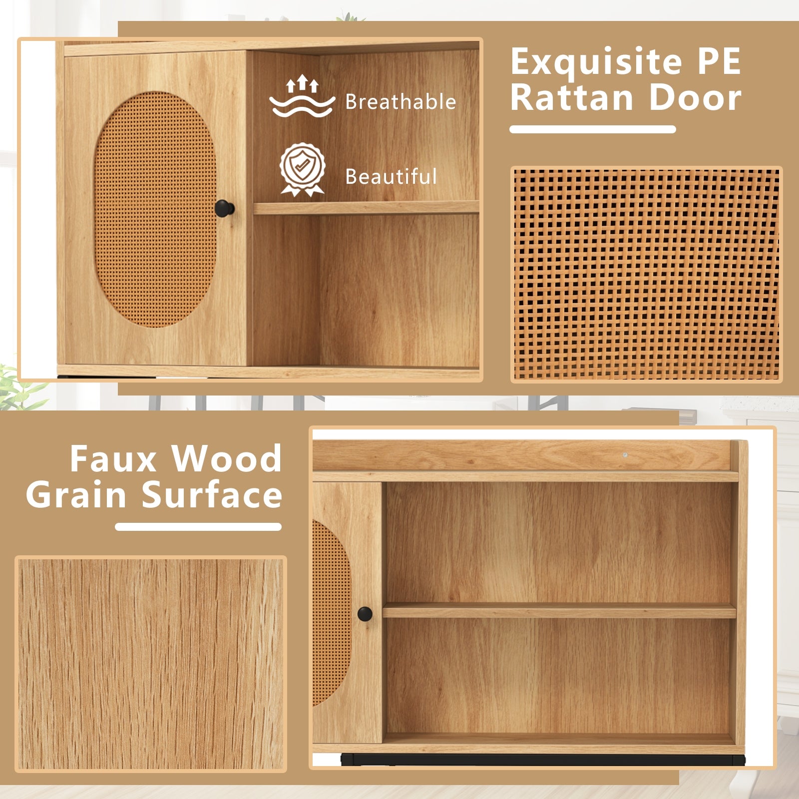 It features a large top surface, five accessible shelves, and an enclosed cabinet, ensuring your items are well-organized. Moreover, the 3-position inner shelf meets your specific needs, while the PE rattan door brings elegant flair. Supported by sturdy metal, the bathroom organizer withstands the rigors of daily use. Additionally, the anti-toppling devices and adjustable feet ensure stability and security. Designed to fit above toilets, the multi-tier storage rack perfectly enhances your bathroom. Expansive Storage Options: With a spacious top, five open shelves and a single-door cabinet, the bathroom organizer has large storage capacity for various items. Besides, the inner shelf is available in 3 heights and ensures neat organization. Outstanding Stability and Safety: Equipped with anti-tipping kits, the above toilet rack is secured firmly in place, promoting stability and safety. Additionally, the adjustable foot pads allow for stability on uneven floors and protect floors from scratches. Built-to-last Structure: The over toilet organizer is made of thick board and sturdy metal, ensuring durability and strong support for objects. Furthermore, the top guardrail protects things from falling and the soft-close hinges ensure quiet operation. Elegantly Crafted Door: Elevate your bathroom’s style with the unique aesthetic of a PE rattan woven cabinet door. This refined feature enhances visual appeal and allows for ventilated storage, which is perfect for bathroom environments. Seamless Integration: The muti-tier storage rack is a versatile structure designed for maximizing space in compact areas, and it can be used above the toilets, washing machines or laundry baskets. Plus, the sleek profile perfectly complements different room decors.