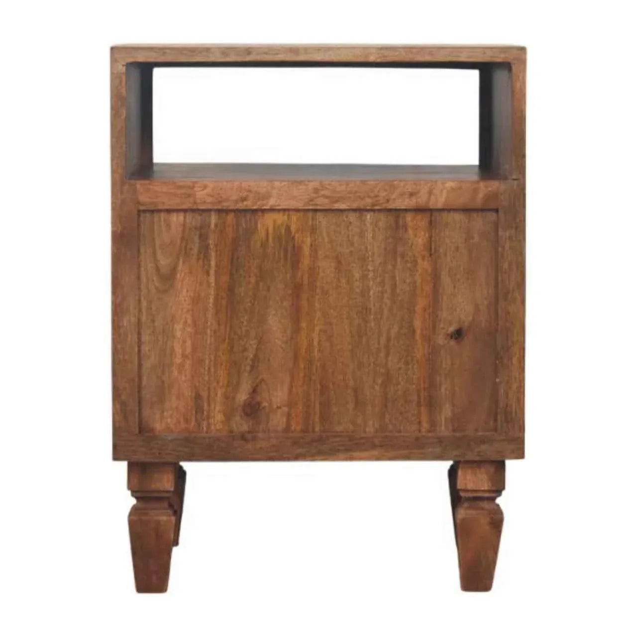 Crafted to illuminate your interiors, the Arno Bedside in Golden Teak finish brings warmth and texture to your home. Its hand-carved drawer fronts feature a distinctive block pattern that exudes artisanal charm, while the natural golden hues of the 100% solid mango wood enhance its inviting appeal. Two practical drawers and an open shelf provide convenient storage for bedside essentials, and the tapered legs add a graceful, elevated profile. Ideal for modern and rustic spaces alike, this piece is where craftsmanship meets everyday elegance.