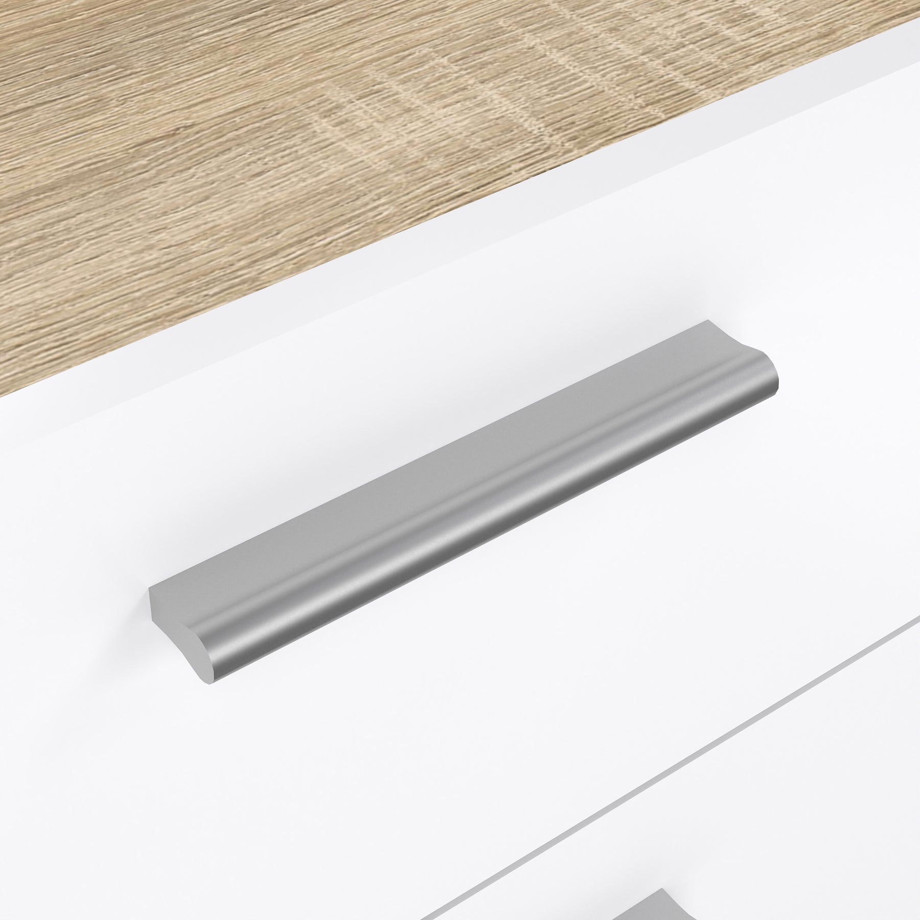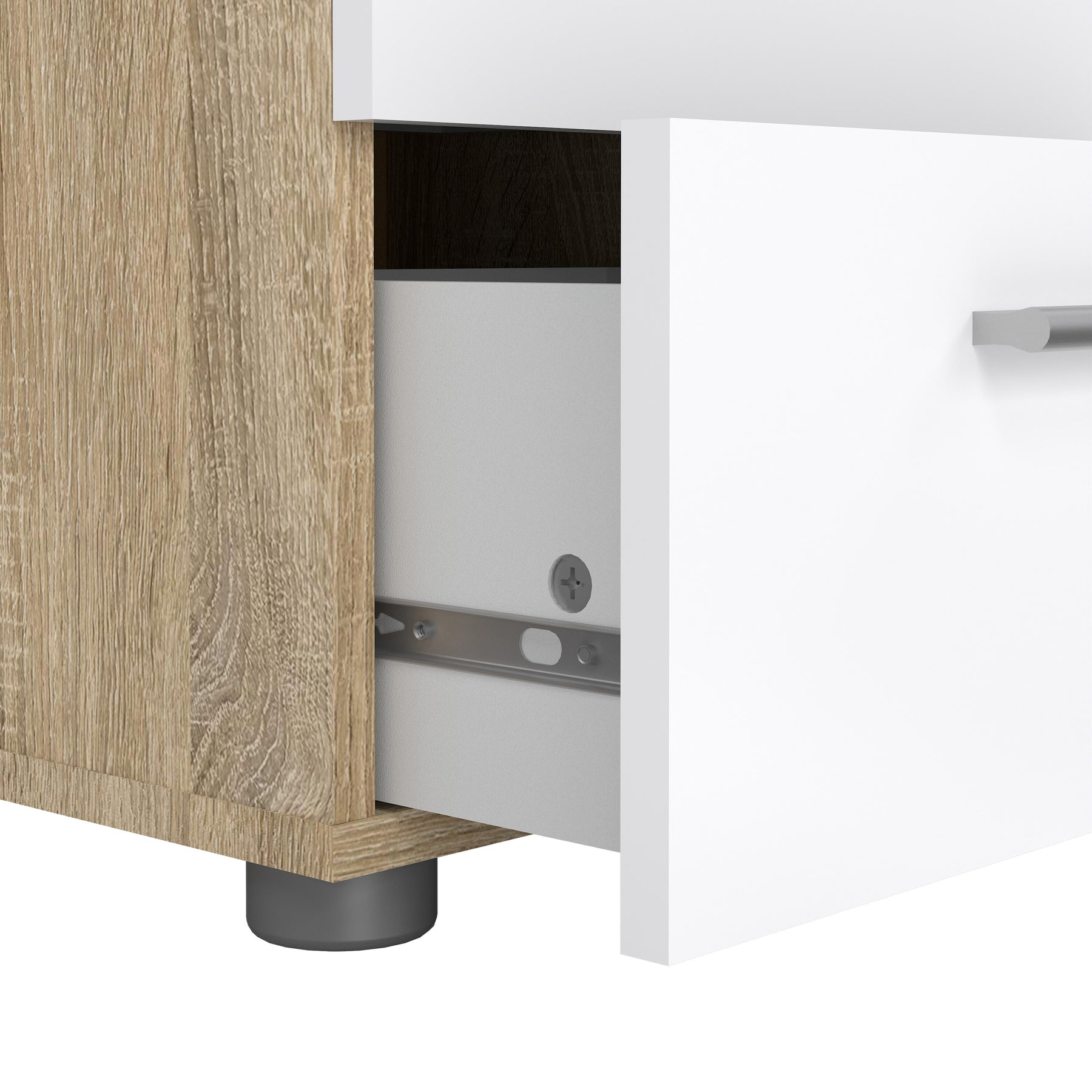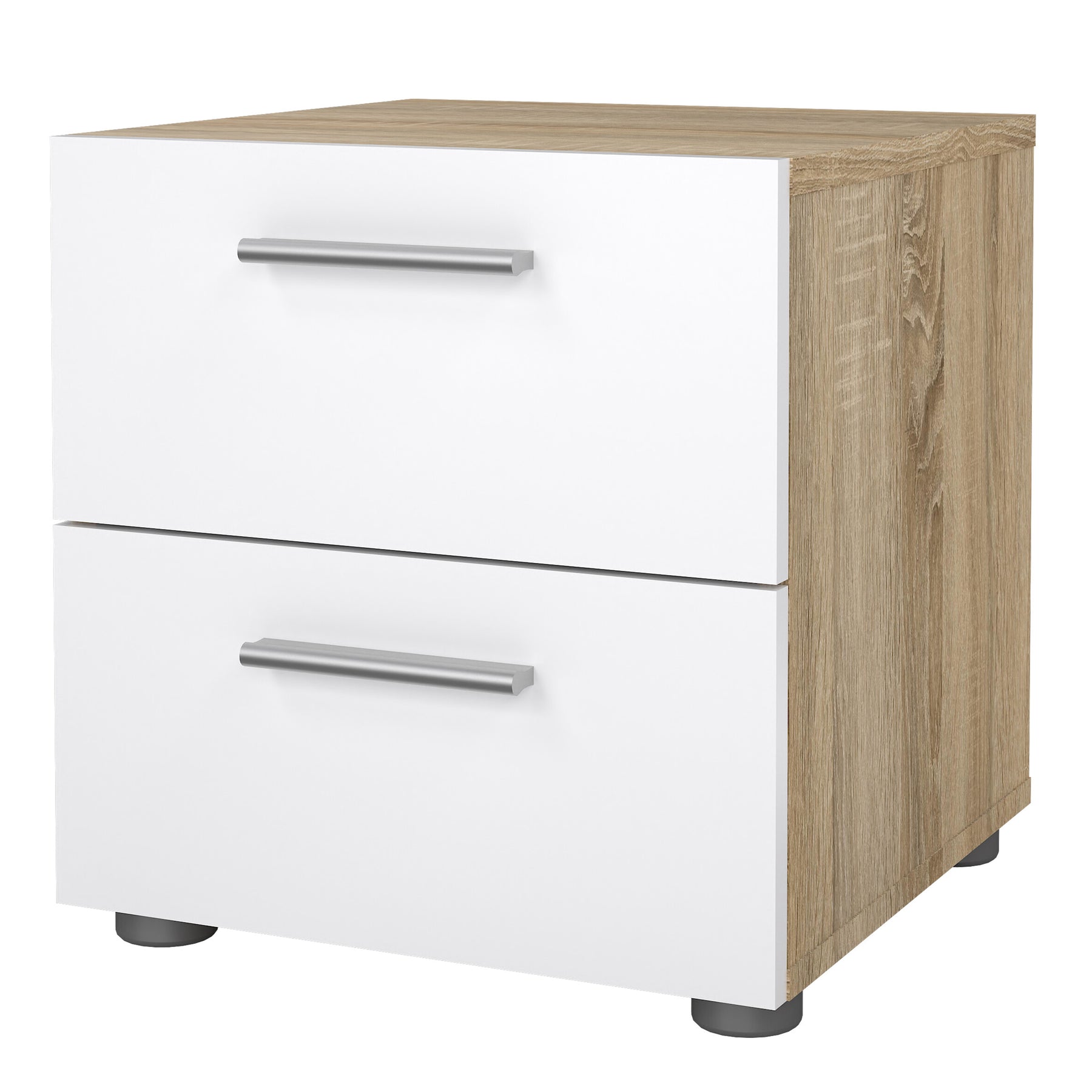 The warm oak finish and subtle white accents make it a versatile addition to any bedroom, blending seamlessly with both minimalist and modern décor., Imagine waking up in a sunlit bedroom with soft neutral tones. This contemporary white nightstand sits gracefully beside your bed, offering a dedicated space for your alarm clock, a lamp, and a morning coffee, while the drawers keep clutter neatly tucked away. It’s equally at home in a guest room or a compact apartment, where space is at a premium but style cannot be compromised., Each bedside table comes with clear, easy-to-follow instructions, answering the question of how to build oak nightstands or how to build a chest of drawers, making assembly stress-free and straightforward. The top plate can hold up to 15 kg (33 lbs) while each drawer supports 3 kg (6.6 lbs), perfect for storing smaller items safely., Perfect Dimensions: Compact yet roomy, it fits beautifully next to any bed or sofa. The drawers measure 33.5 x 33.1 x 12.7 cm (13.19 x 13.03 x 5 in) and slide out 21.8 cm (8.58 in) for easy access., Durable Materials: Crafted from oak, chipboard, and HDF with plastic handles, this contemporary white nightstand is built to last and easy to clean., Ample Storage: Two drawers hold up to 3 kg (6.6 lb) each, ideal for bedside essentials, small electronics, or even secret snack stashes.