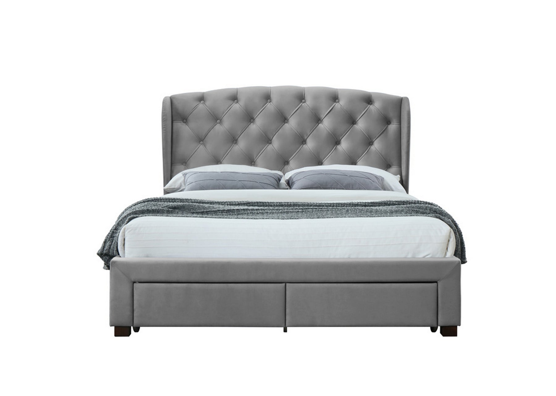 Elevate your bedroom ambiance with the Elegant Wingback Bed Frame with Tufted Headboard and Storage Drawers. Crafted to combine sophisticated design and practical storage, this bed frame creates a serene and organized retreat. The plush tufted wingback headboard adds a touch of timeless elegance, while the integrated storage drawers maximize space without compromising style.