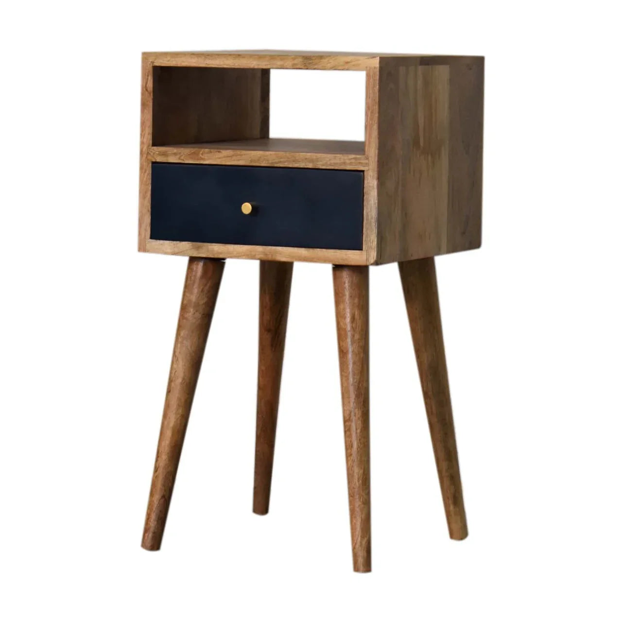 This beautifully designed bedside is constructed from 100% solid mango wood and has a fine oak-ish finish. Useful storage space is available with 1 navy hand-painted drawer, 1 shelf, and a decent-sized tabletop to place any ornaments. Other features include 4 Scandinavian-styled legs to give the piece a modern style that will suit most decors.
