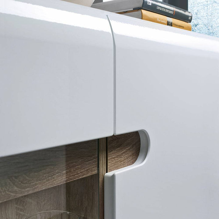 Elevate your living space with the Chelsea Living 3 Door Glazed Sideboard in White with a Truffle Oak Trim, a stunning blend of modern aesthetics and practical functionality. This sideboard seamlessly integrates into contemporary homes, offering both style and versatility.