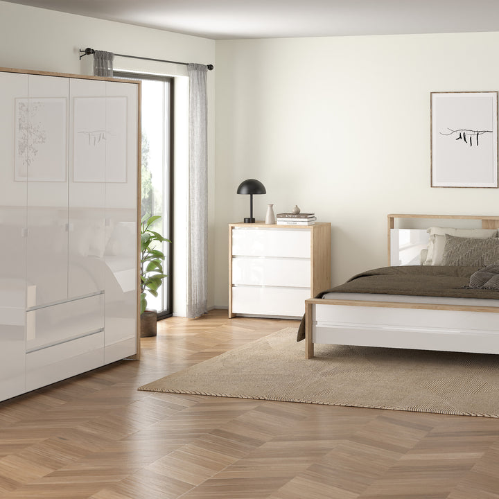 Features: The oak frame adds warmth and depth, its grainy texture offering a tactile delight as you run your fingers over the wood. Paired with the sleek, glossy white front, the chest strikes a harmonious balance between wooden charm and modern finesse. It complements both tonal interiors with warm wood floors and light-painted walls, as well as popular colour schemes such as beige and taupe.