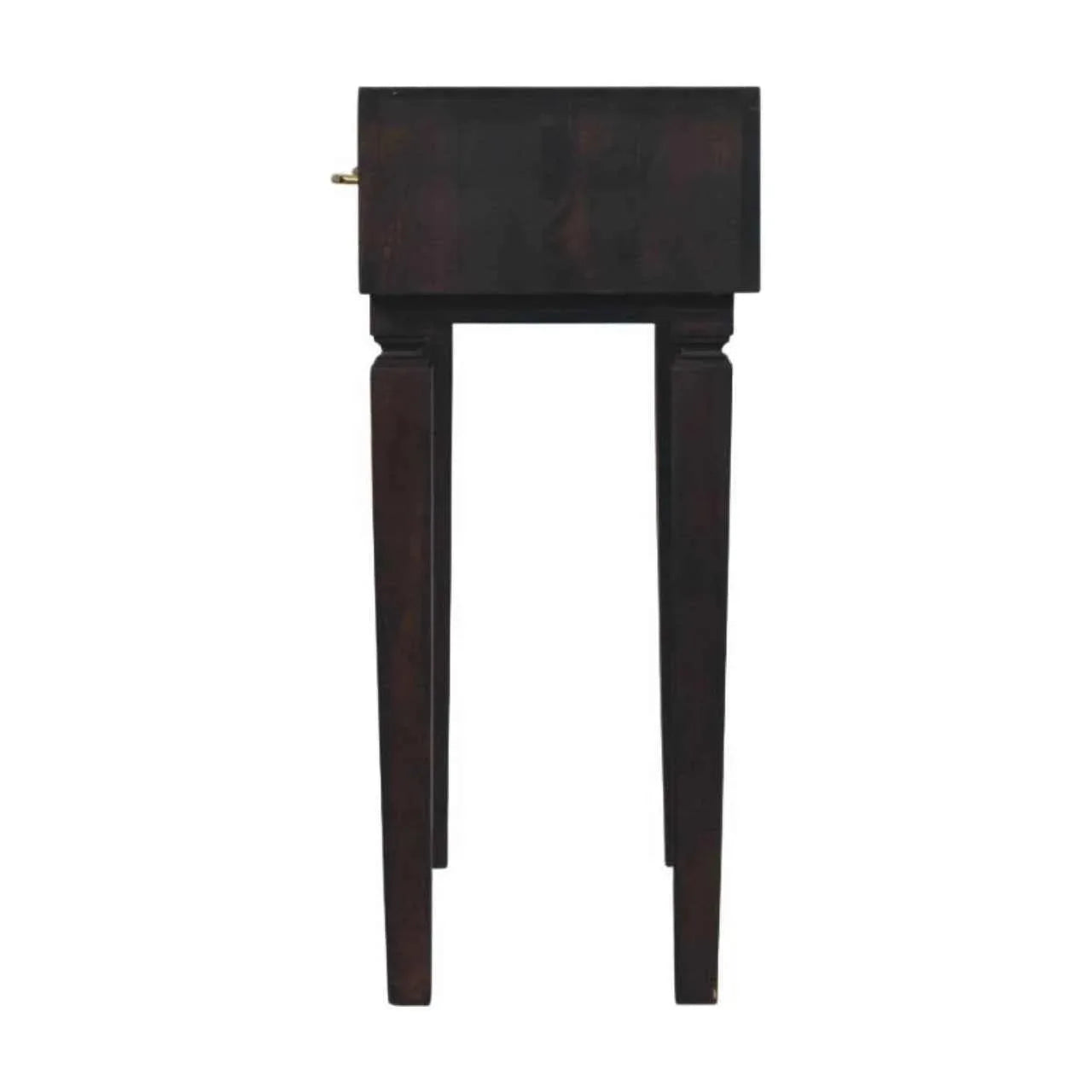 Elevate your hallway or living space with the Arno Console Table in our signature Velvet Mocha finish. Crafted from 100% solid mango wood, this refined piece showcases bold hand-carved drawer fronts that create a rich, dimensional texture. Two drawers offer practical storage while slender legs with traditional turn details lend timeless sophistication. Whether styled with décor or used as a compact desk, the Arno Console is a striking blend of artisanal craftsmanship and everyday utility.