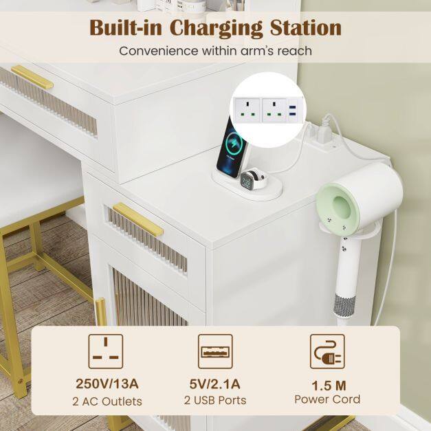 The Dressing Table and Chair Set with 3 Lighting Modes and Adjustable Brightness-White not only enhances your beauty routine but also adds a touch of sophistication to your space. Its sleek white finish and golden accents create a chic atmosphere that complements any décor.