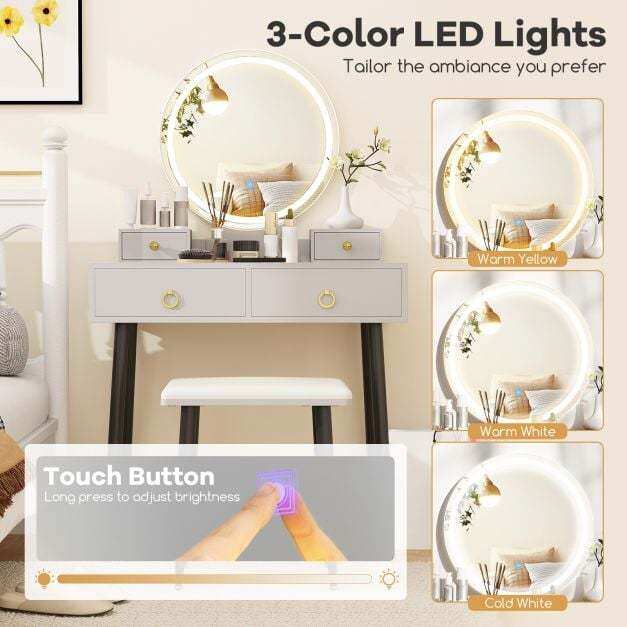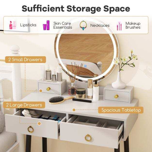 This makeup table features an LED lighted mirror offering adjustable brightness and 3 color options to suit your needs. You can stay organized with a spacious tabletop, 2 small tabletop drawers and 2 large drawers. The sleek legs are equipped with adjustable foot pads for enhanced stability. This stylish and practical dressing table set makes a perfect gift for loved ones on special occasions, combining functionality and elegance beautifully. LED Lighted Mirror: The lighted mirror features 3-color LED lights with adjustable brightness and a touch button, offering warm yellow, warm white or cool white lighting according to your needs. Ample Storage Space: This dressing table is equipped with 2 small drawers and 2 large drawers for items of different sizes, keeping your space tidy and organized. Table dimension: 80 x 40 x 134 cm (L x W x H). Stable and Safe Structure: This vanity desk set can be attached to the wall with an included anti-toppling device, which is safer for families with pets and kids. The adjustable foot pads ensure stability even on uneven floor. Cushioned Stool Included: This elegant vanity table will elevate your daily makeup routine, complete with a cushioned stool that provides superior comfort and support. This sturdy stool can hold up to 150 kg. Stylish and Ideal Gift: Perfect for personal use or as a thoughtful gift for your wife, daughter, or friends on special occasions, this dressing table set serves both practical and decorative purposes beautifully.