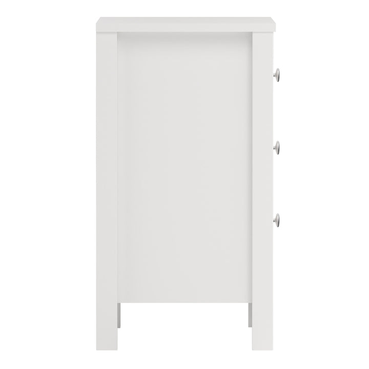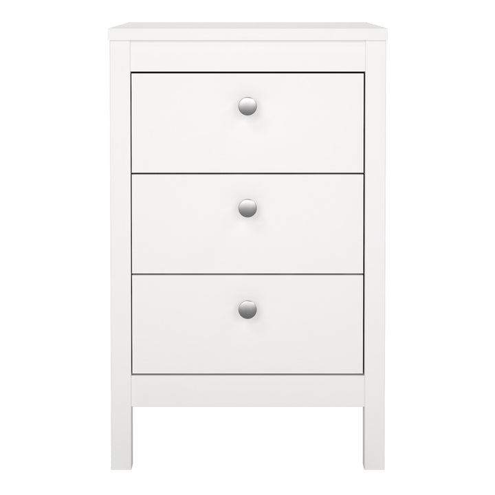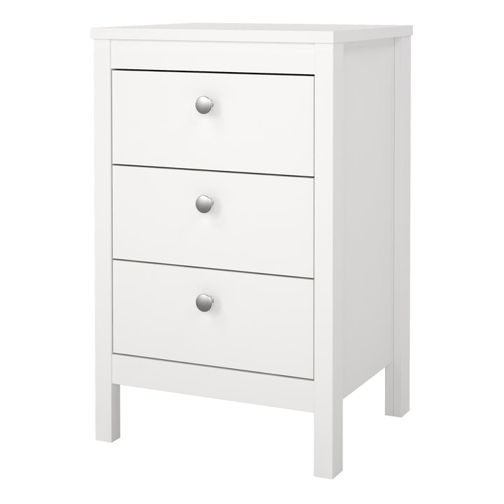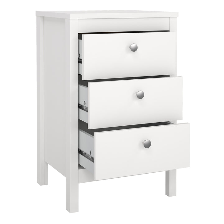 Enhance your bedroom with the elegant Madrid Bedside Table. Made with a white finish, it features three drawers with sleek metal handles and smooth gliding runners. This stylish and functional piece is perfect for any modern bedroom.