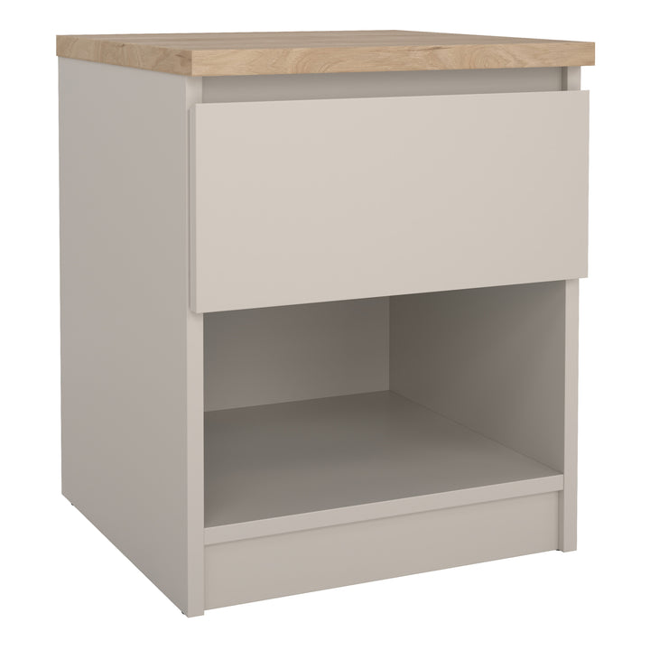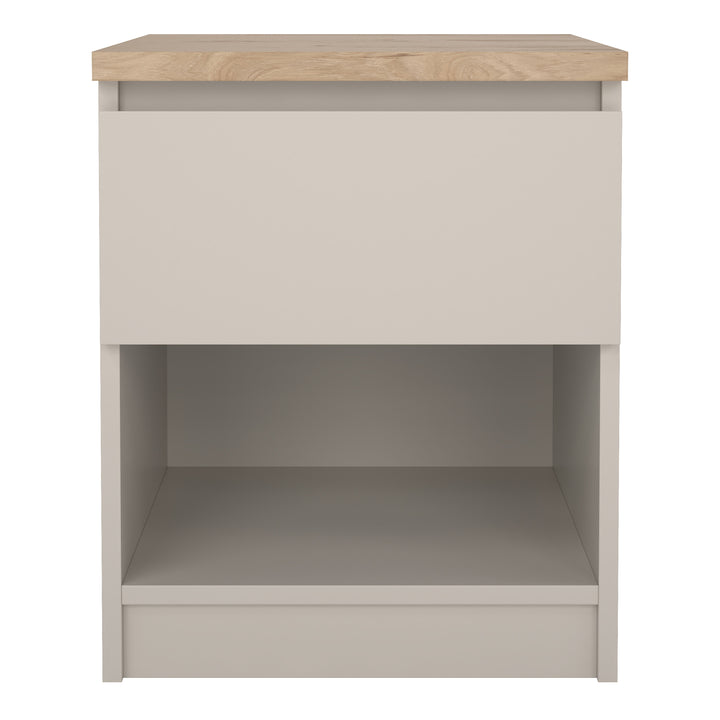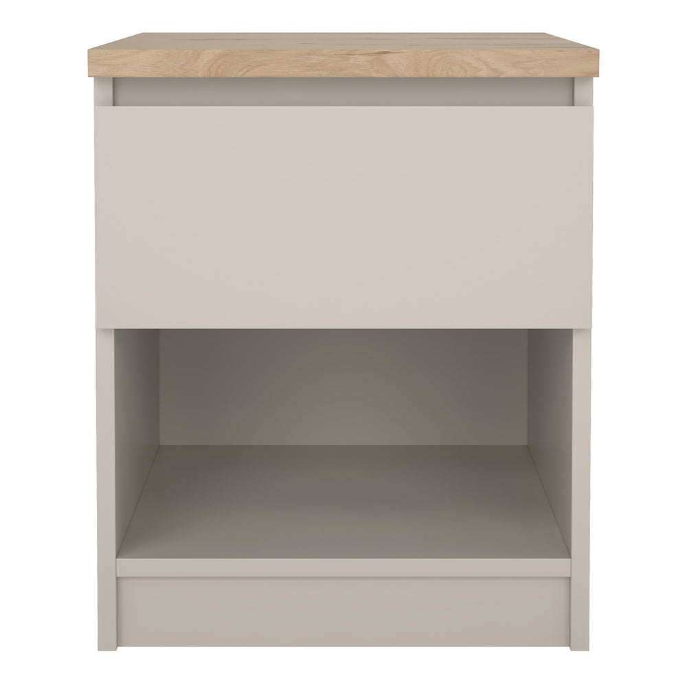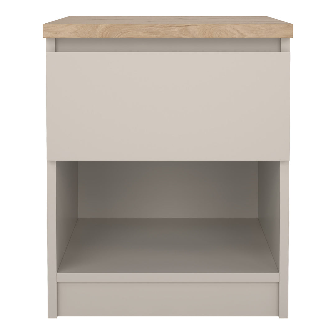 Peek into this beautifully styled and assembled bedside table, and you will find the beige cashmere Bedside Table from the Naia collection, a perfect blend of practicality and modern design. Its soft cream finish, paired with a natural oak top, brings a touch of understated elegance to any bedroom. Compact yet functional, this nightstand features a single drawer for discreet storage, ideal for keeping night time essentials close at hand. The open shelf below is perfect for displaying books, decor items, or even a potted plant, making it both stylish and versatile.