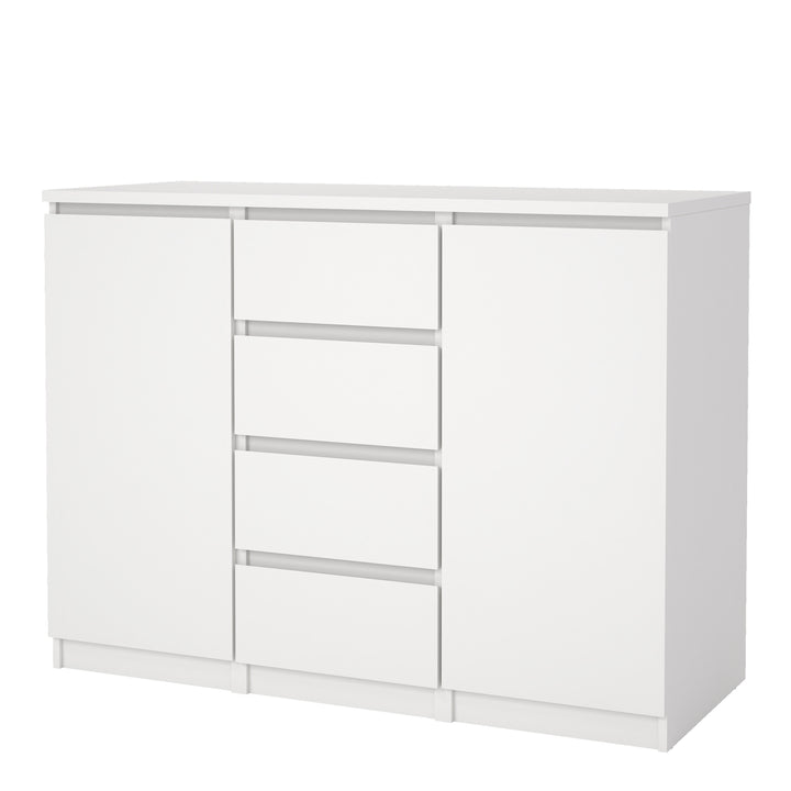 Features: With two symmetrical doors flanking a central column of 4 spacious drawers, the sideboard offers remarkable versatility. Behind each door, you'll discover 2 adjustable shelves-perfect for housing anything from extra bedding and towels to entertainment equipment or dining essentials, depending on where you choose to place this adaptable piece. The shelves behind each door have a maximum weight of 5 kilograms which is more than adequate space for your essentials.