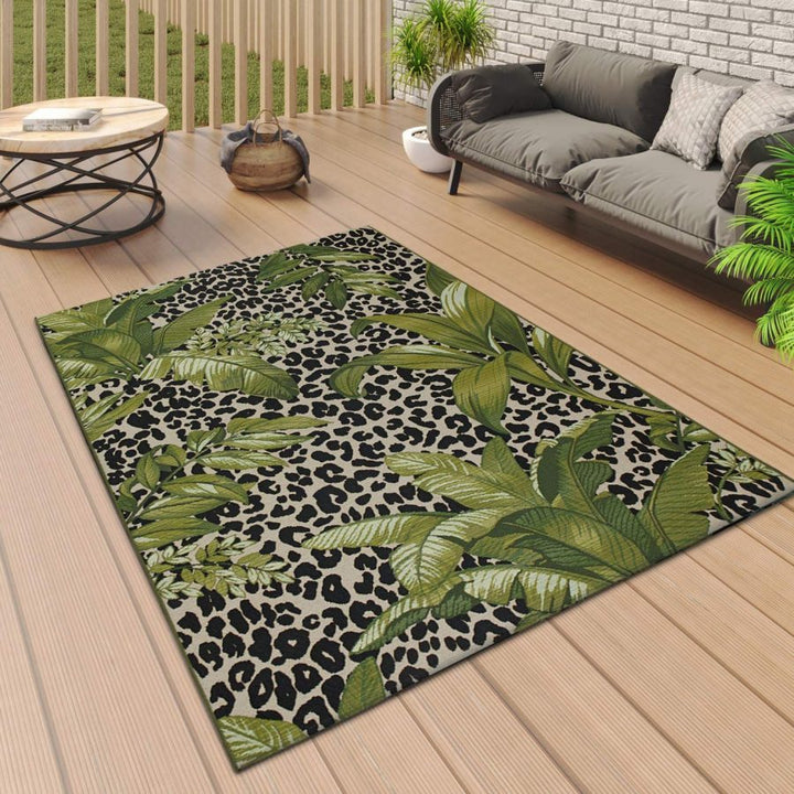 Indoor Outdoor Rug Cream Green Tropical Animal Print - TidySpaces