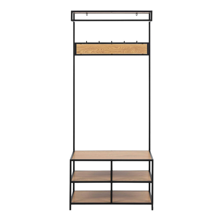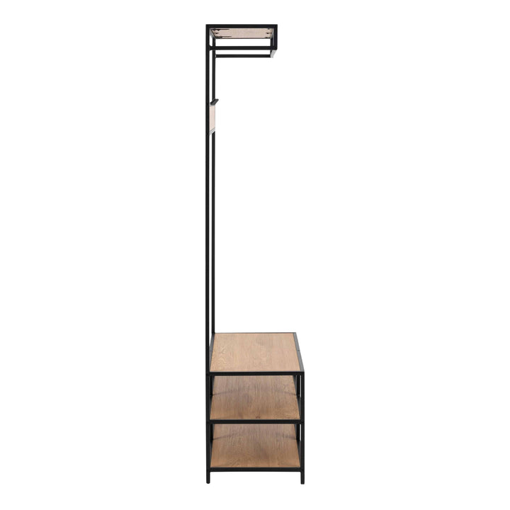 Add a touch of elegance to your room with this chic clothes rack, featuring a matte black steel frame and base. It includes three spacious shelves with a wild oak effect finish, offering a sophisticated way to display and organize your attire.