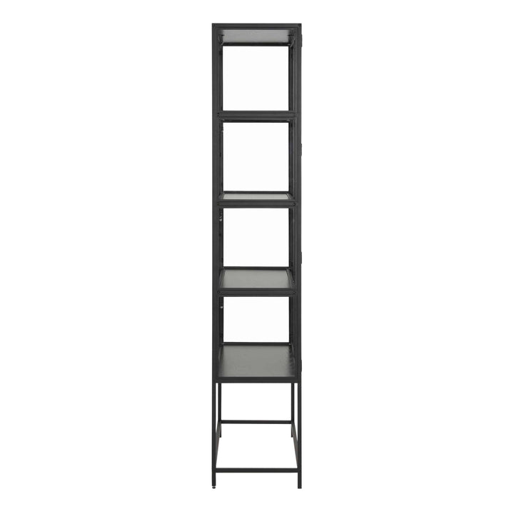 Show off your style with this display cabinet, combining a matte black steel frame and base with ash black shelves. The clear tempered glass doors add a touch of elegance, making it a perfect showcase for your favorite items.