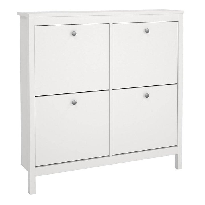 Transform your entryway with the elegant Madrid Shoe Cabinet 4 Flip Down Doors in White. This contemporary piece seamlessly combines style and functionality, offering a chic way to declutter your space.
