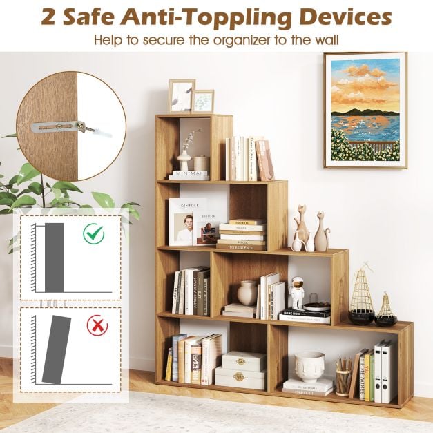 The step shaped bookshelf adds visual interest and modern flair to any room. Each tier creates an expansive yet compact display area that makes organizing and accessing items easy. The distinct storage cubes offer dedicated spaces for various items, helping to keep your room clutter-free. When set against the wall, 2 anti-toppling kits securely attach the bookcase to the wall to avoid wobbling. It serves as an ideal organizer for any space needing a touch of modern elegance and efficient storage.