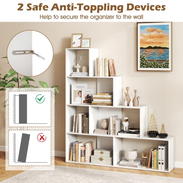 The step shaped bookshelf adds visual interest and modern flair to any room. Each tier creates an expansive yet compact display area that makes organizing and accessing items easy. The distinct storage cubes offer dedicated spaces for various items, helping to keep your room clutter-free. When set against the wall, 2 anti-toppling kits securely attach the bookcase to the wall to avoid wobbling. It serves as an ideal organizer for any space needing a touch of modern elegance and efficient storage.