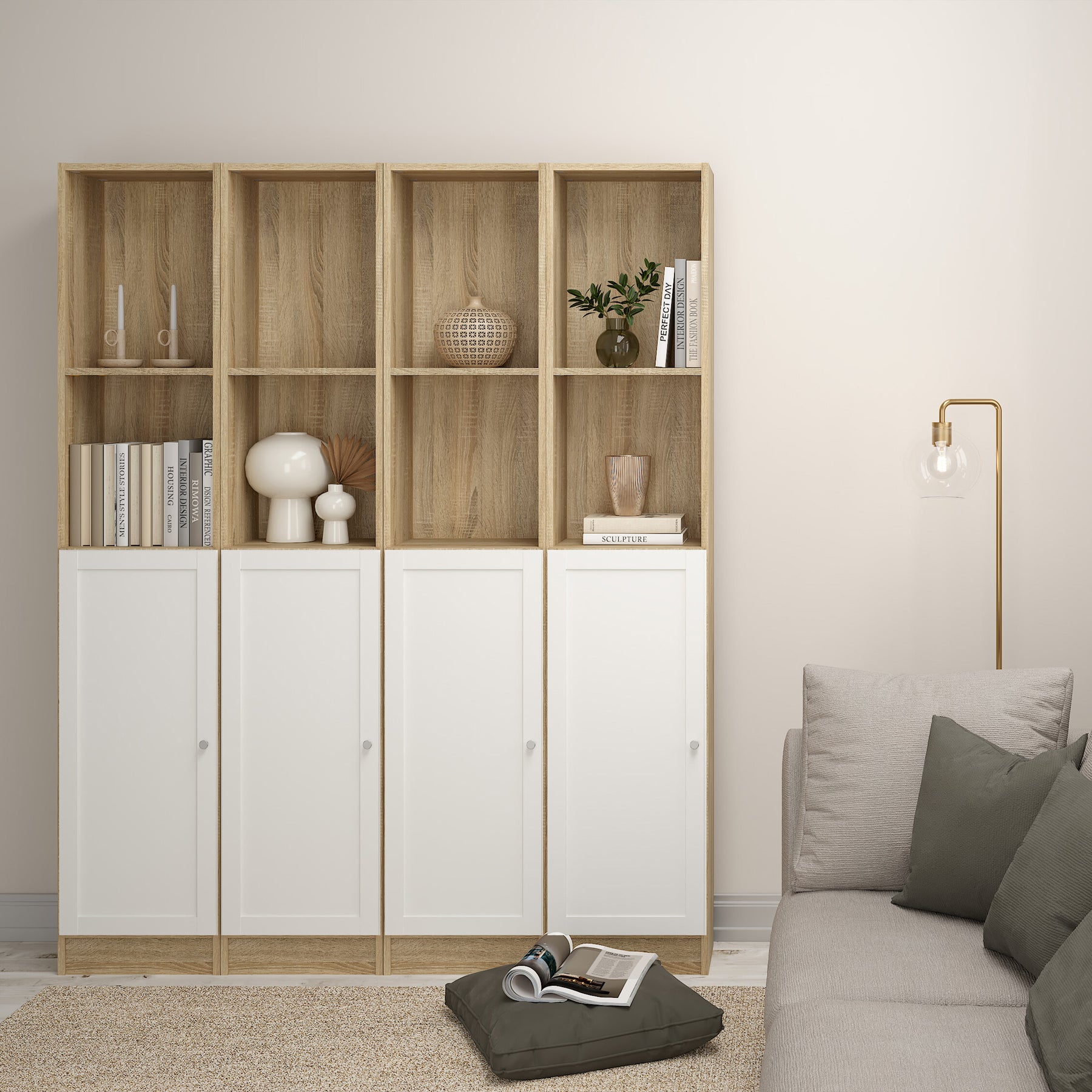 Open at the top for everyday accessibility, closed at the bottom for concealed storage. This oak and white tall narrow combination bookcase is designed for compact living spaces without compromising on quality. The warm oak body pairs beautifully with a solid white door and silver handle, creating a modern, balanced aesthetic.
